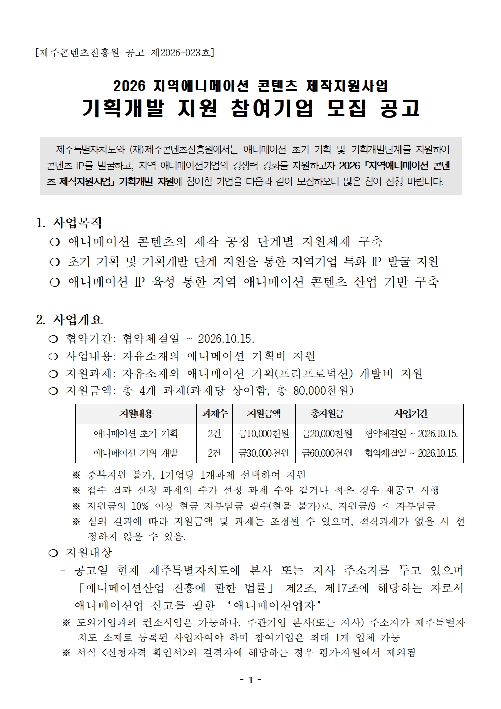 공고중 2026 지역애니메이션 콘텐츠 제작지원사업 기획개발 지원 참여기업 모집 공고