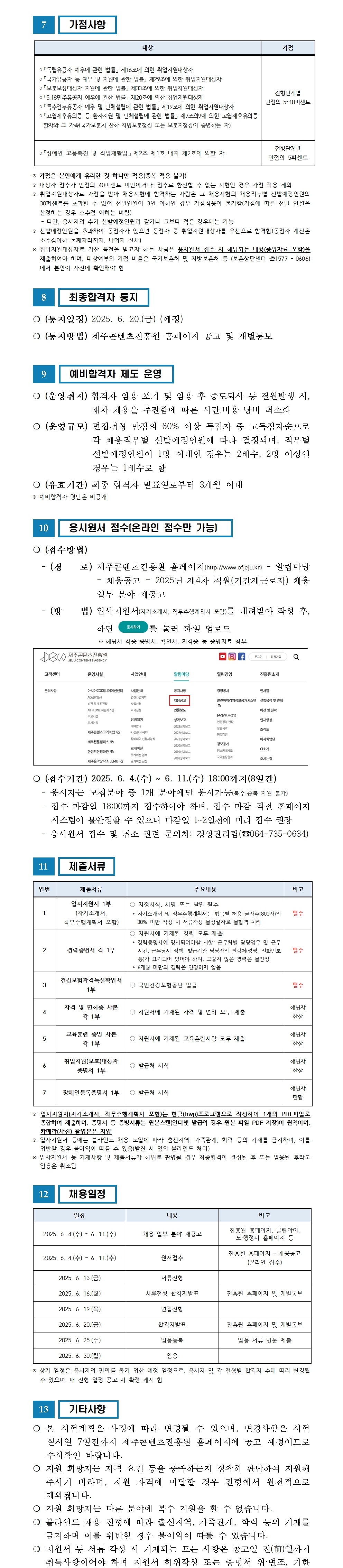 재단법인 제주콘텐츠진흥원 2025년 제4차 직원(기간제근로자) 채용 일부 분야 재공고 게시물 상세보기