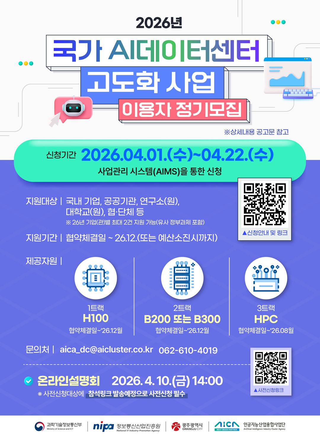 2026년 국가 AI데이터센터 고도화사업 이용자 정기모집 공고..