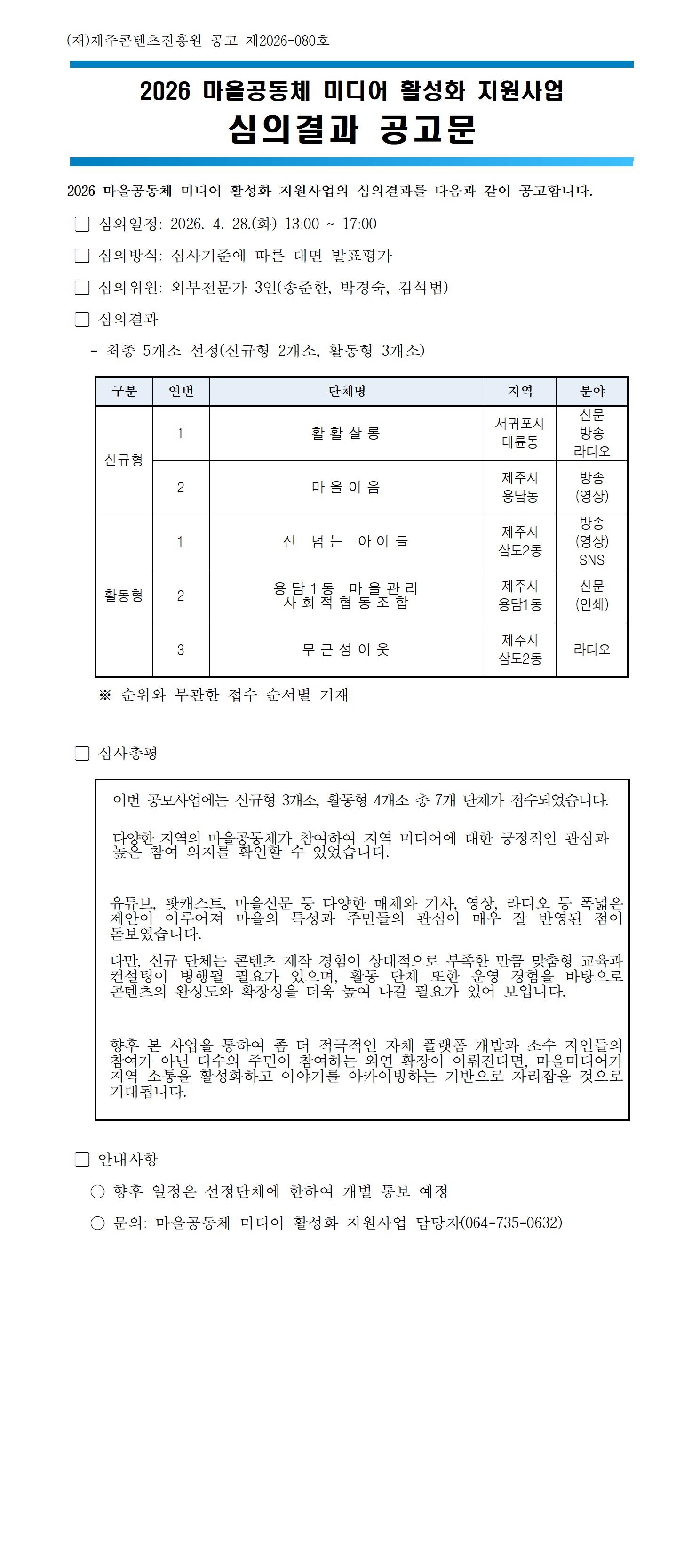 2026 마을공동체 미디어 활성화 지원사업 심의결과 공고