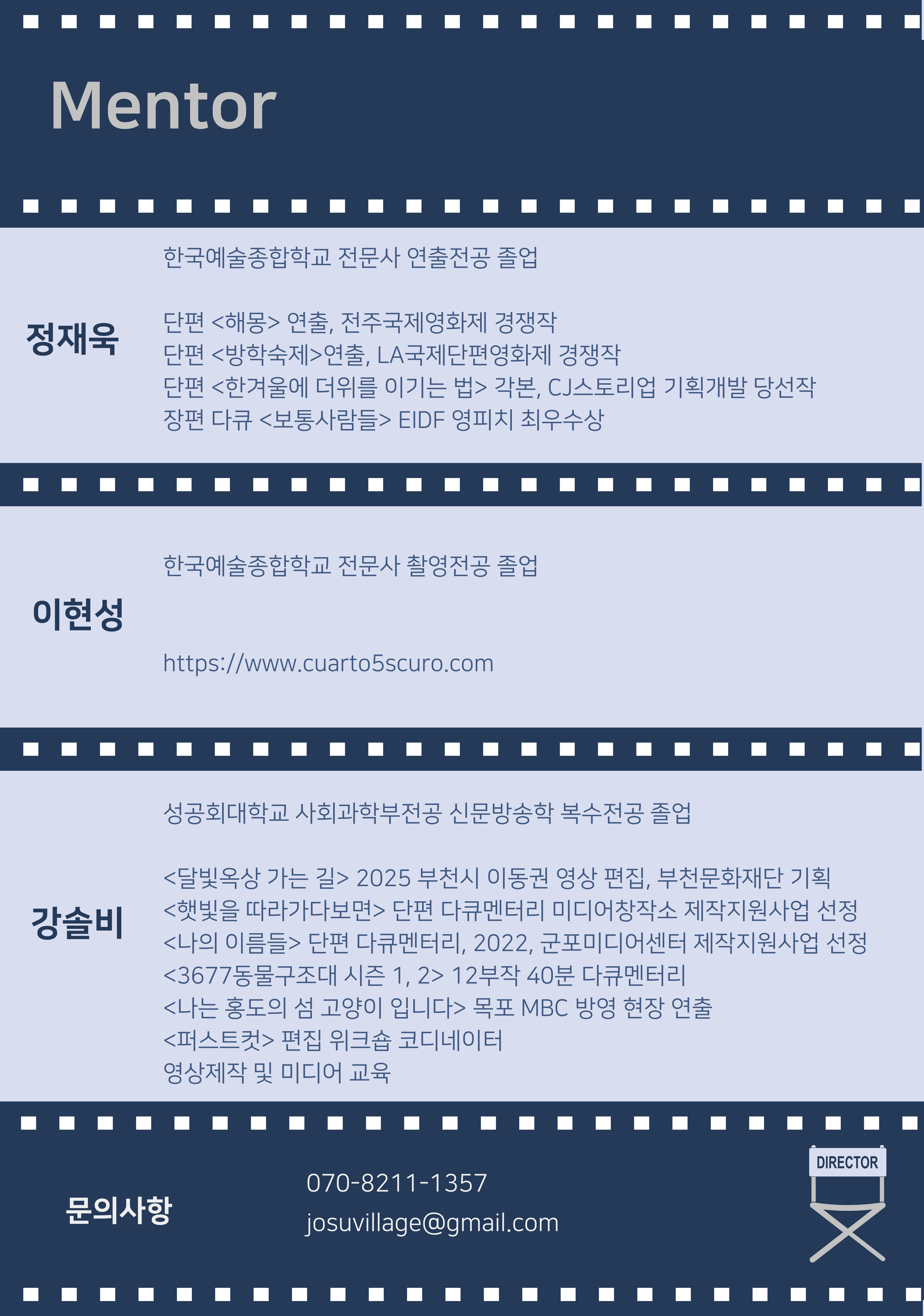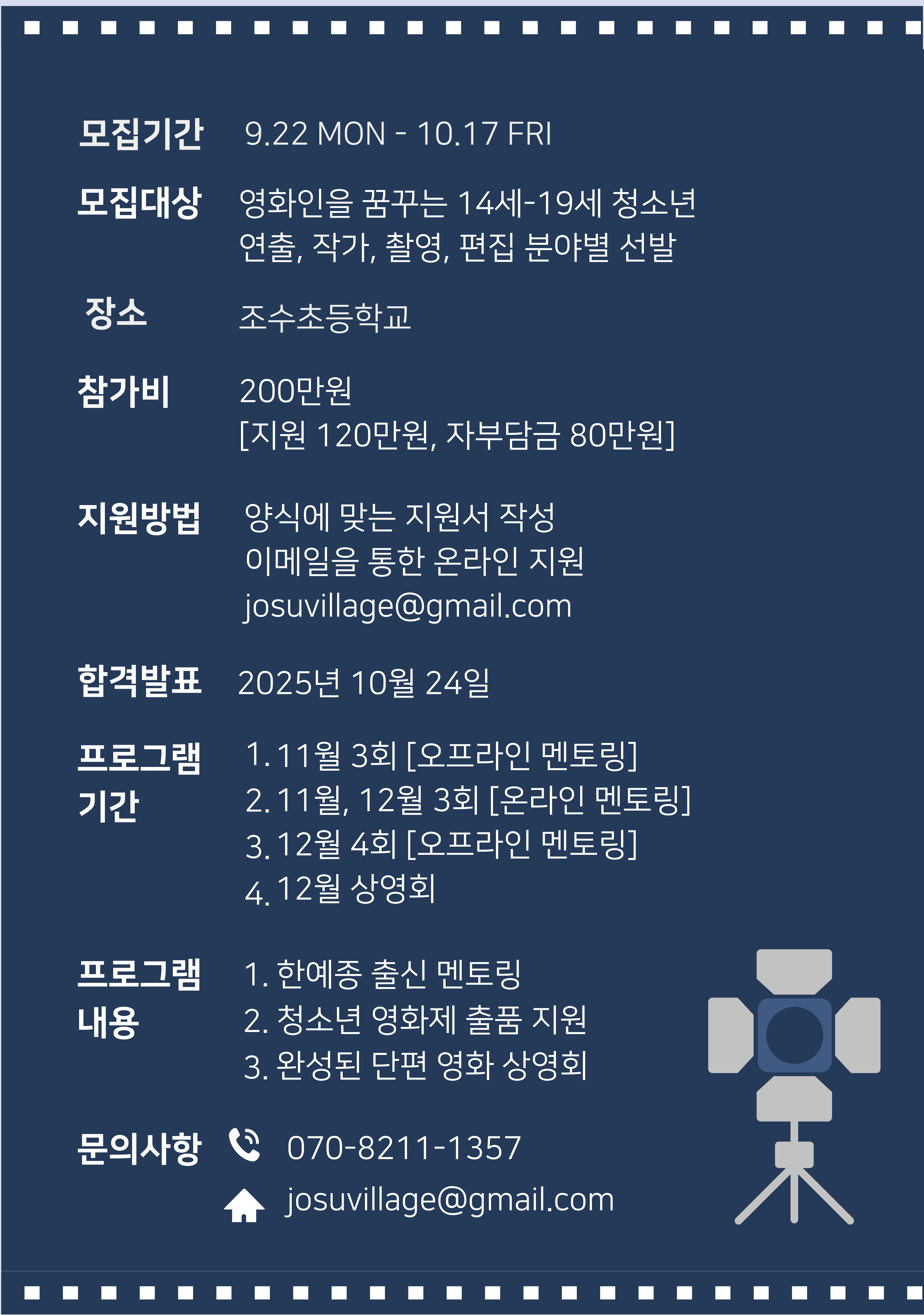 멘토와 함께하는 단편 영화 [극, 다큐멘터리] 제작 프로그램 장소 : 조수초등학교 모집기간 : 9.22. ~ 10.17. 모집대상 영화인을 꿈꾸는 14세~19세 청소년 (연출, 작가, 촬영, 편집 부야별 선발) 참가비 : 200만원(지원 120만원, 자부담금 80만원) 지원방법 : 양식에 맞는 지원서 작성 이메일을 통한 온라인 지원 josuvillage@gmail.com 합격발표 : 2025년 10월 24일 문의사항 : 070-8211-1357 / josuvillage@gmail.com ![]() ![]() ![]() |