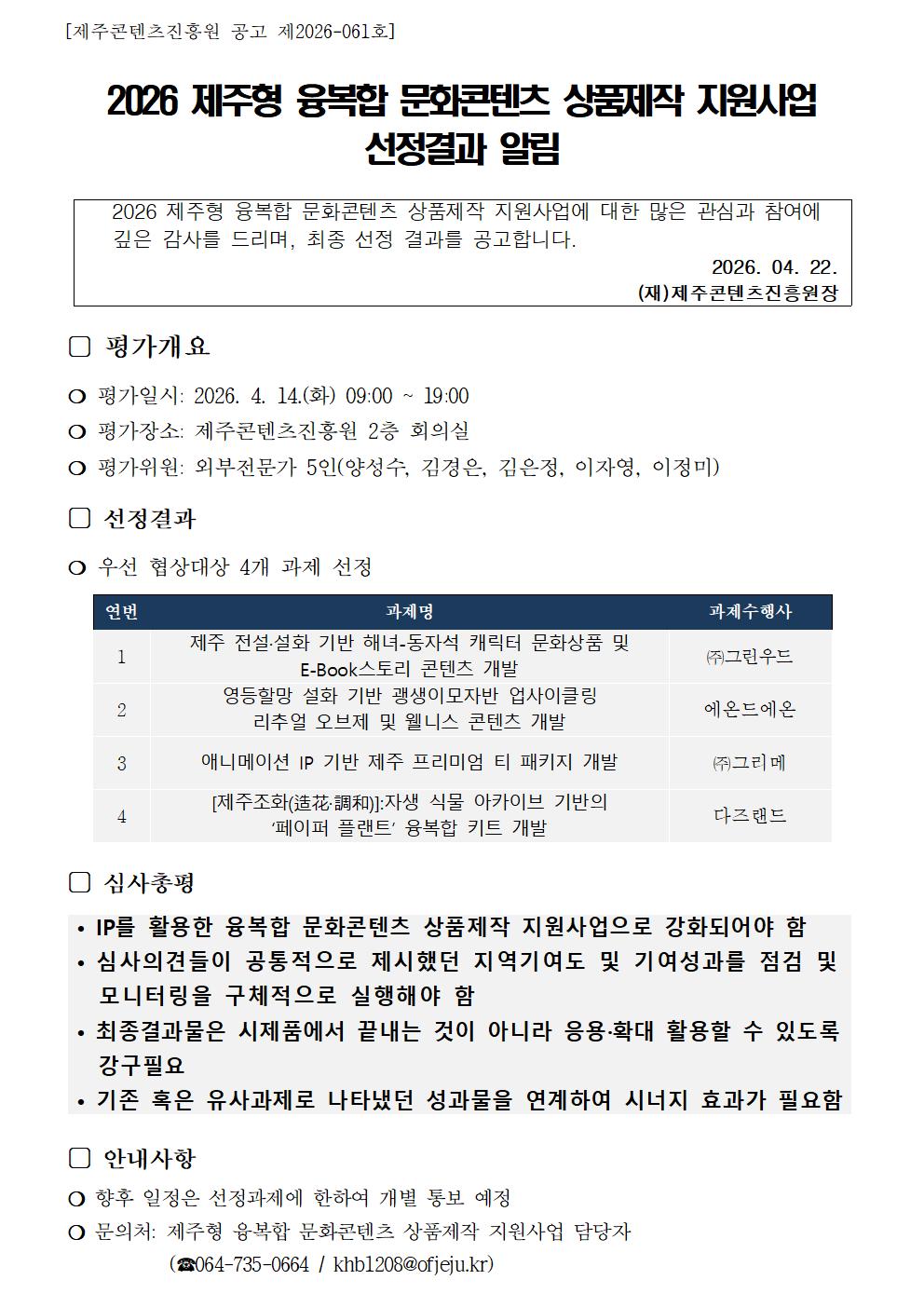 2026 제주형 융복합 문화콘텐츠 상품제작 지원사업 선정결과 알림..