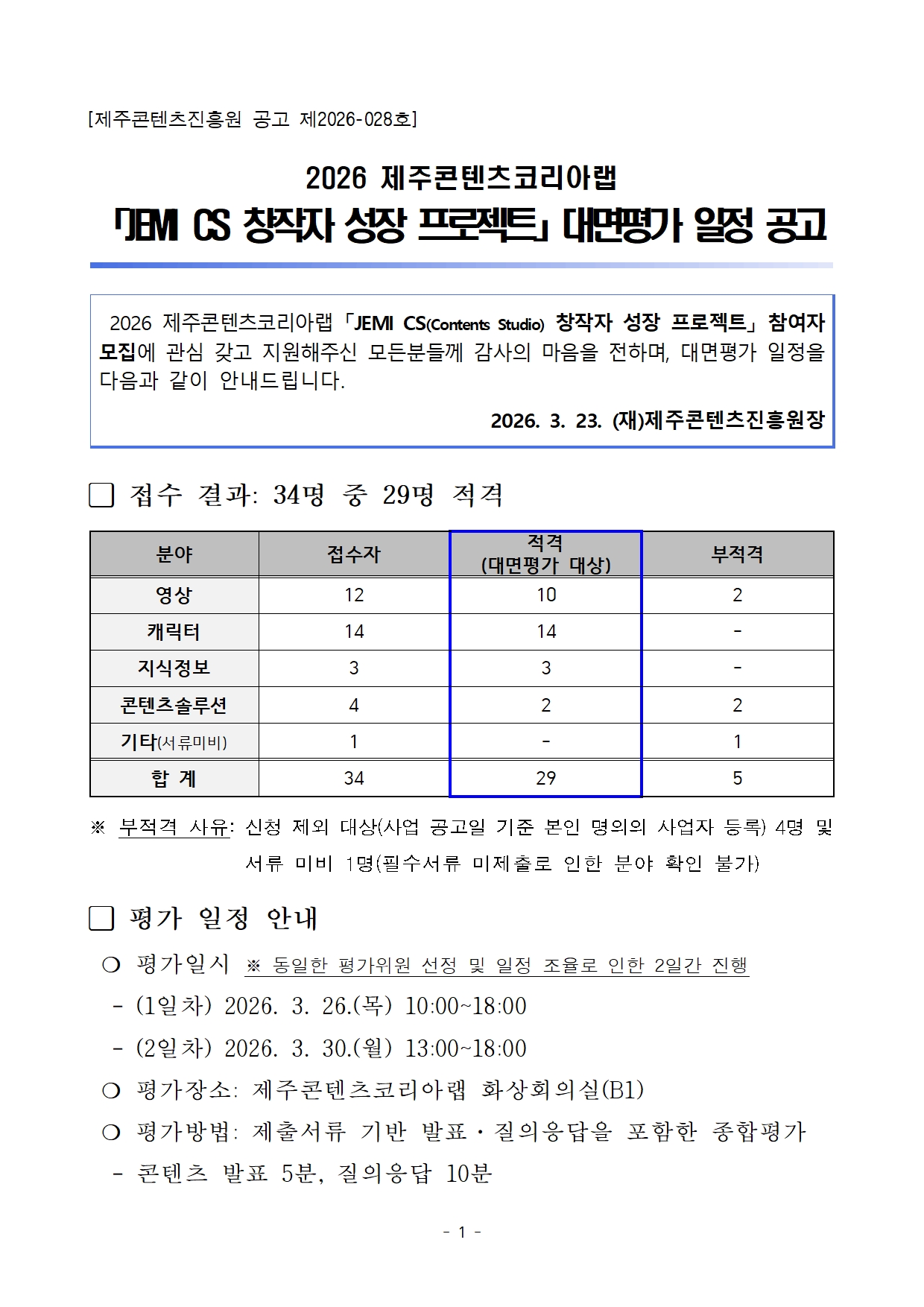 2026「JEMI CS 창작자 성장 프로젝트」대면평가 일정 공고..