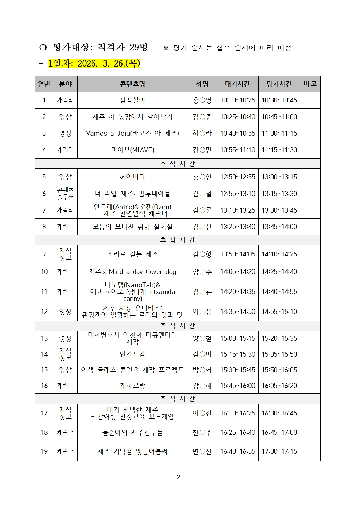 2026 제주웹툰캠퍼스 웹툰창작작가실 입주작가 1차 선정평가 결..