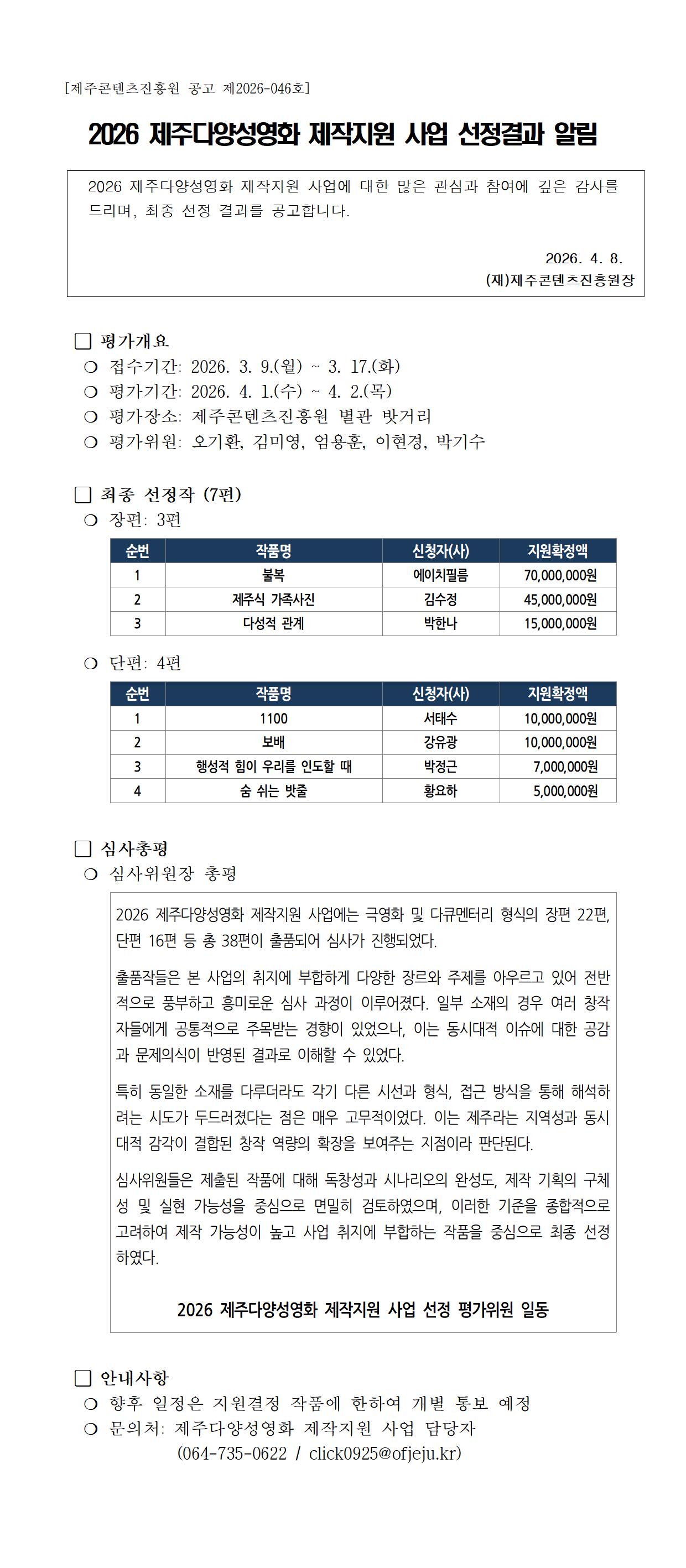 2026 제주다양성영화 제작지원 사업 면접평가 안내 공고 ..
