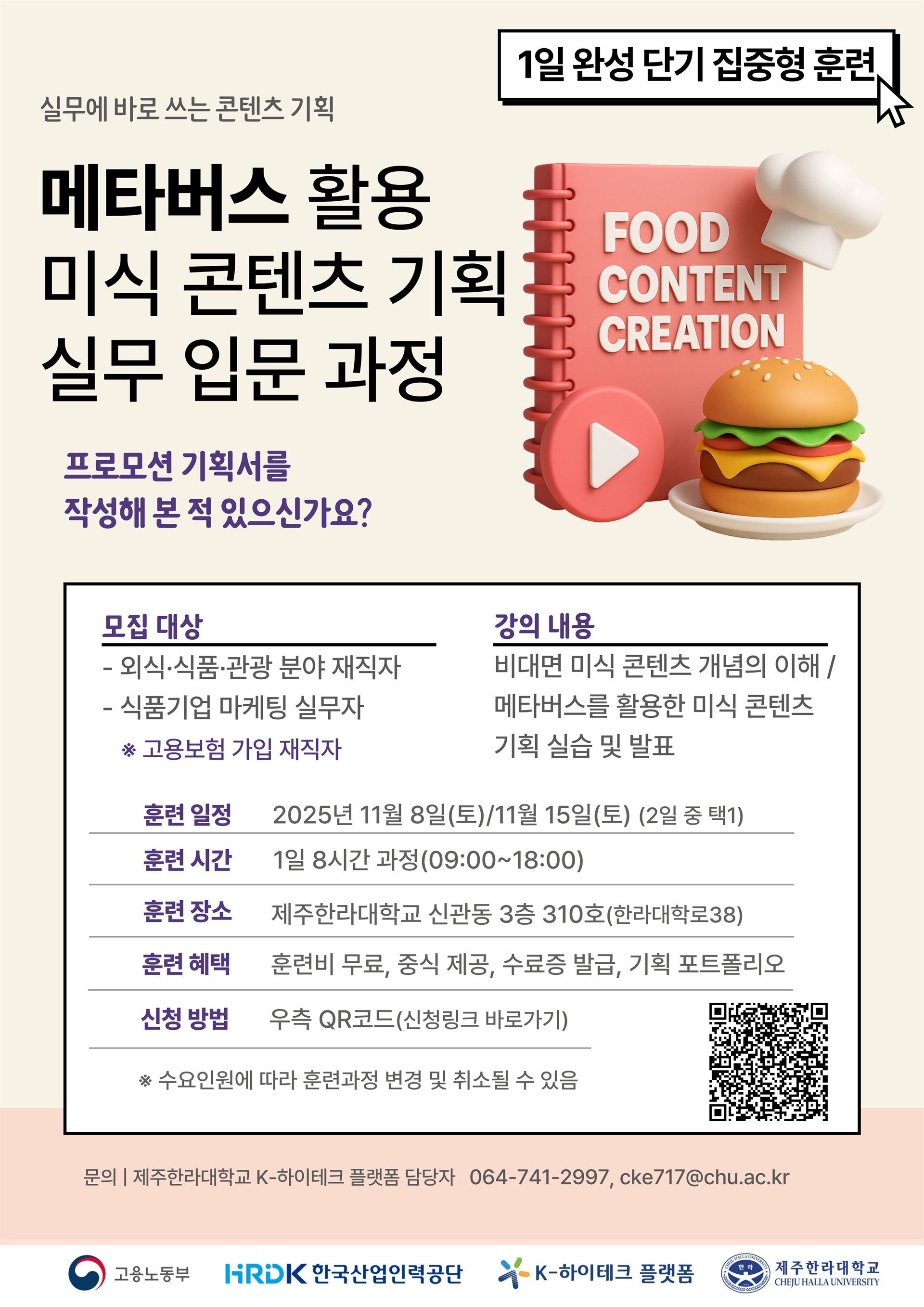 | [ 타기관공고 ] [제주한라대학교] 미식 콘텐츠 기획 실무 입문 과정 모집 안내 | |||