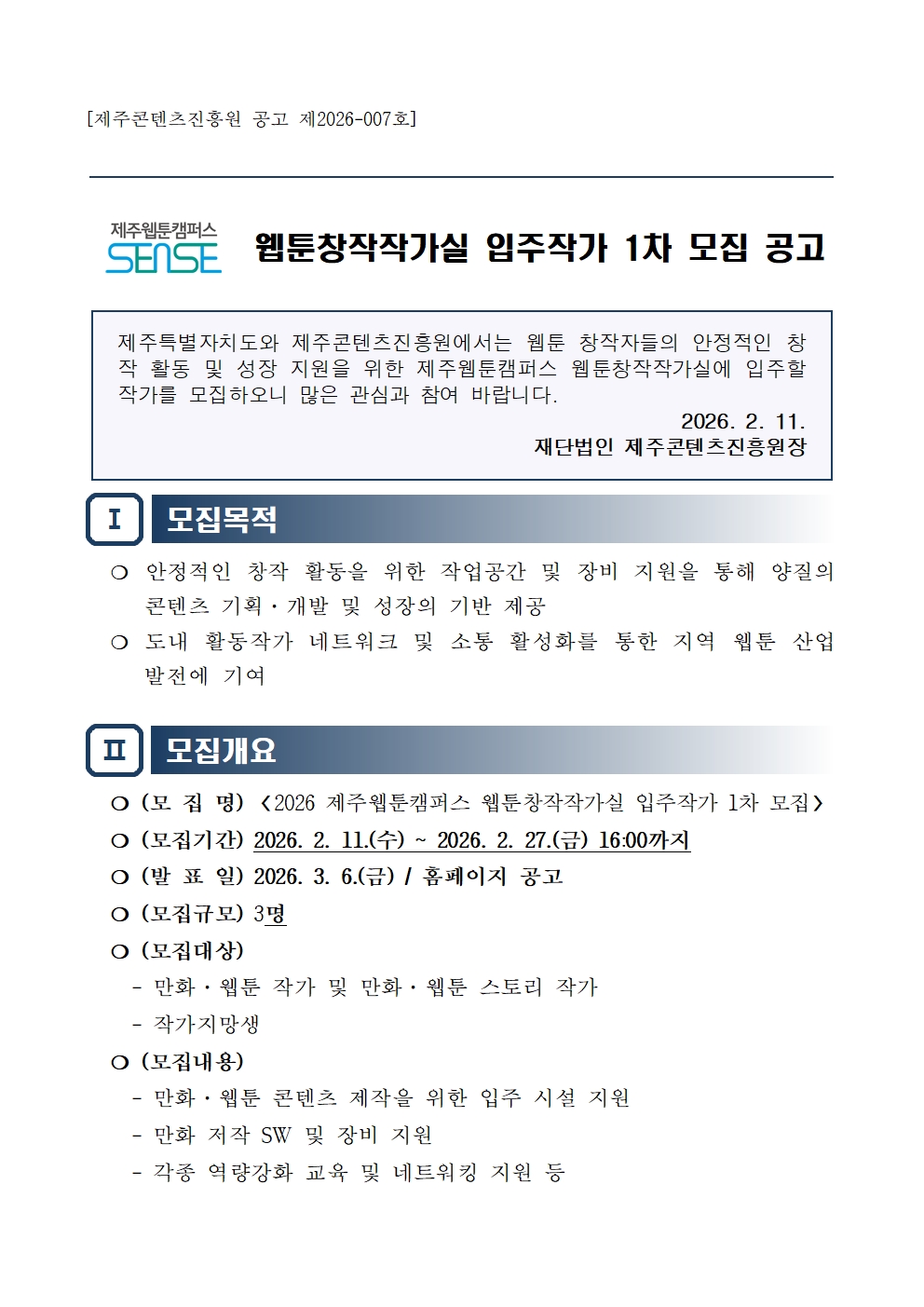 2026 제주웹툰캠퍼스 웹툰창작작가실 입주작가 1차 모집