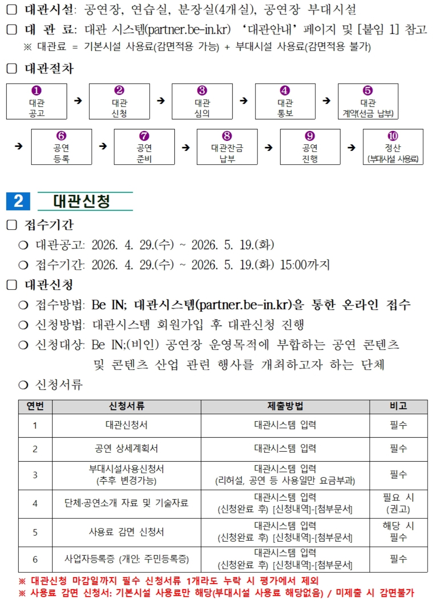 | 첨부 #1 | [붙임 1] 2026년 Be IN;(비인) 공연장 하반기 정기 대관공고문.pdf (241 KBytes) | ||