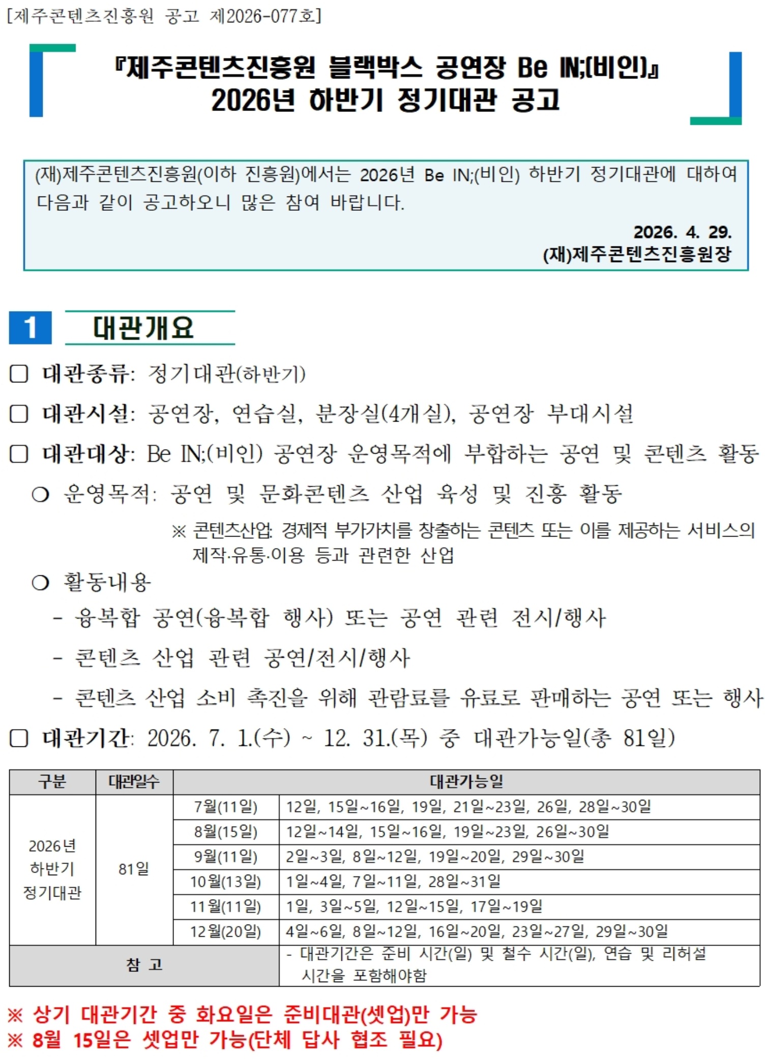 | 첨부 #2 | [붙임 2] 2026년 하반기 정기대관 캘린더.xlsx (31 KBytes) | ||