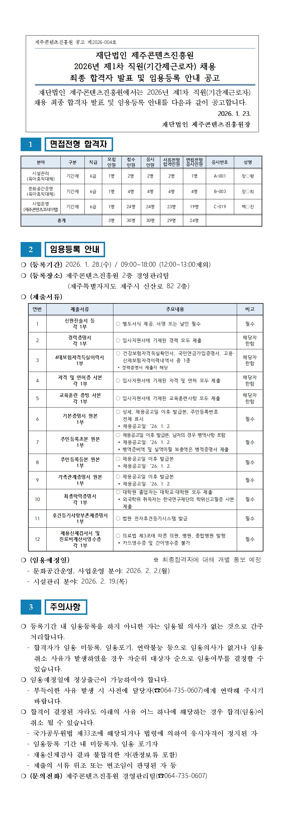 재단법인 제주콘텐츠진흥원 2026년 제1차 직원(기간제근로자) 채용 최종 합격자 발표 ..