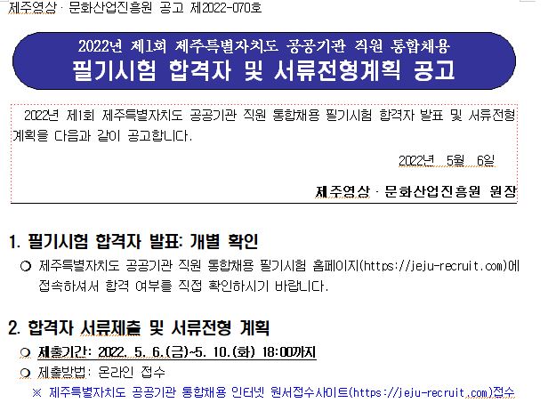 | 2022년 제1회 제주특별자치도 공공기관 직원 통합채용 필기시험 합격자 및 서류전형계획 공고 | |||