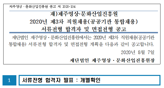 | 재)제주영상·문화산업진흥원 2020년 제3차 직원채용(공공기관 통합채용) 서류전형 합격자 및 면접전형 공고 | |||