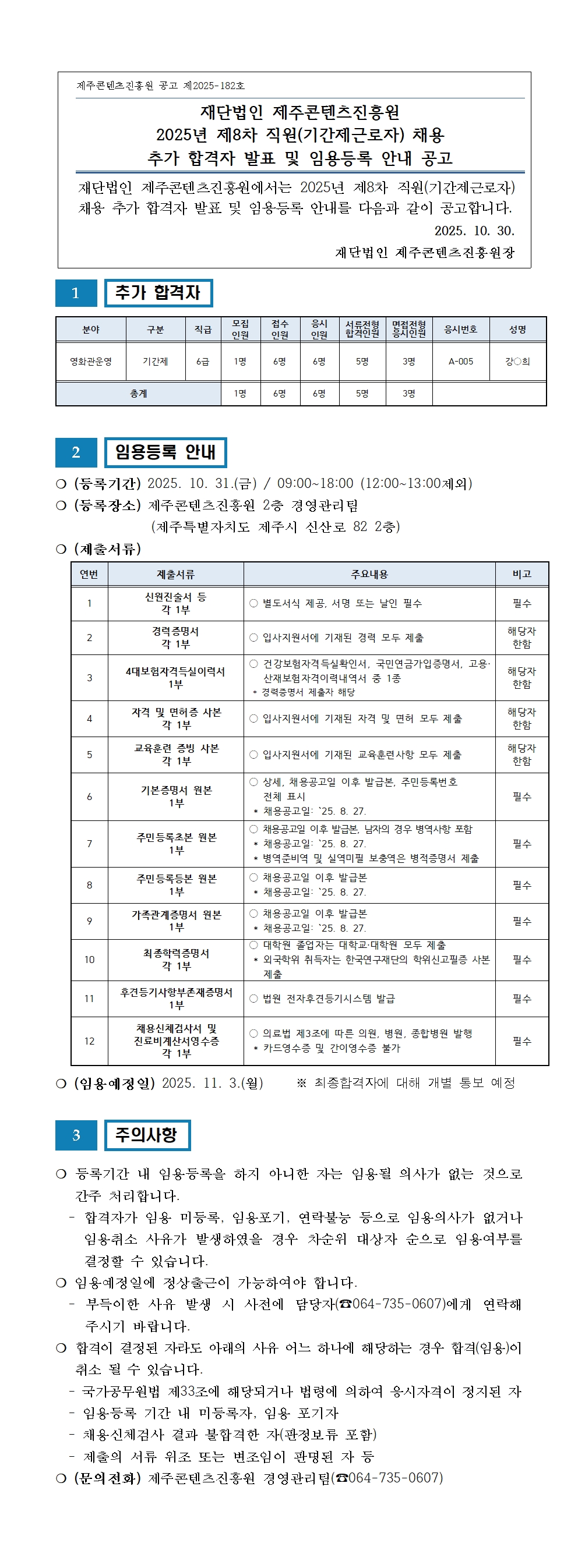 재단법인 제주콘텐츠진흥원 2025년 제8차 직원(기간제근로자) 채용 추가 합격자 발표 ..