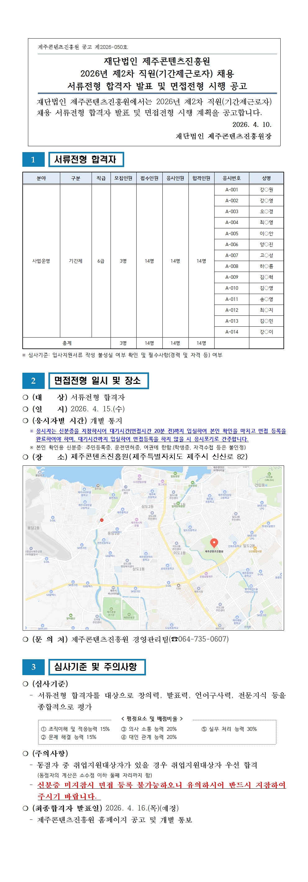 재단법인 제주콘텐츠진흥원 2026년 제1차 직원(기간제근로자) 채용 서류전형 합격자 ..