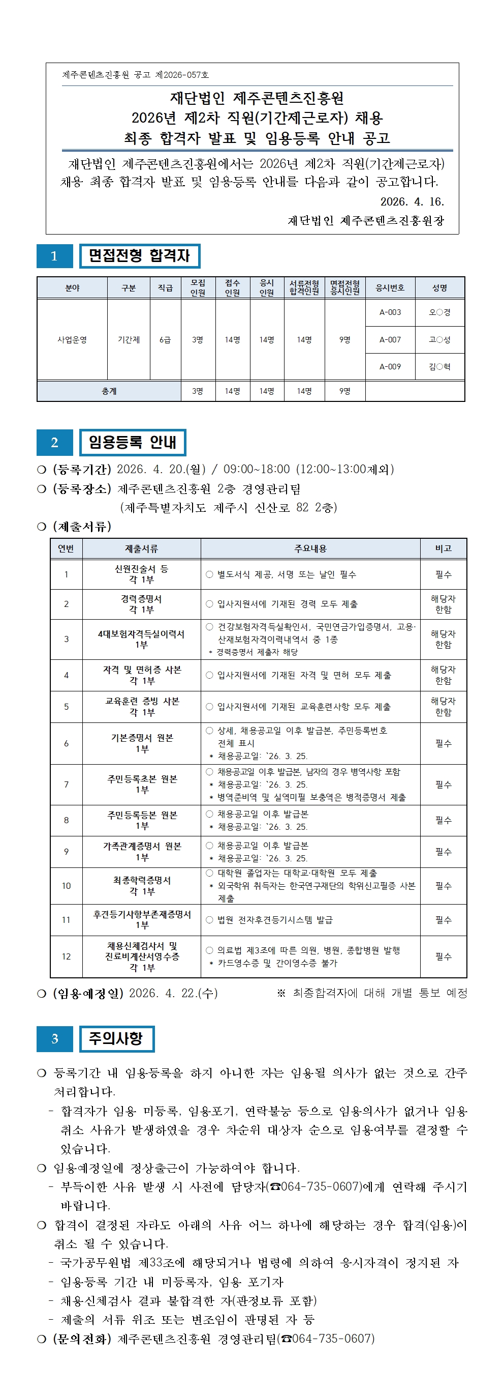 재단법인 제주콘텐츠진흥원 2026년 제2차 직원(기간제근로자) 채용 최종 합격자 발표 ..