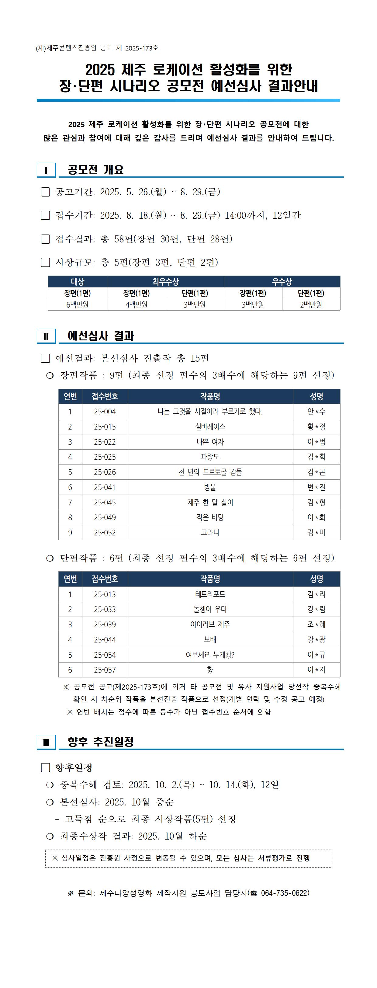 2025 제주 로케이션 활성화를 위한 장・단편 시나리오 공모전 예선심사 결과안내..