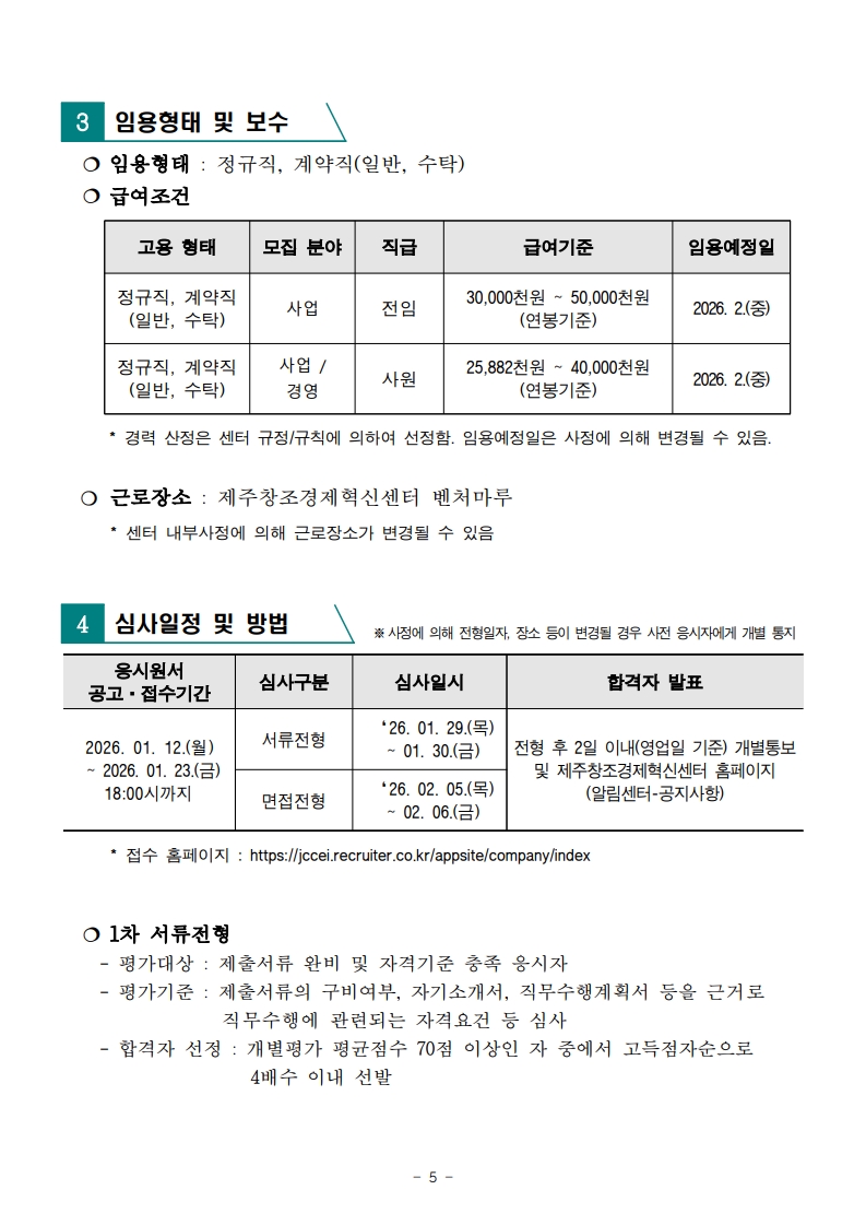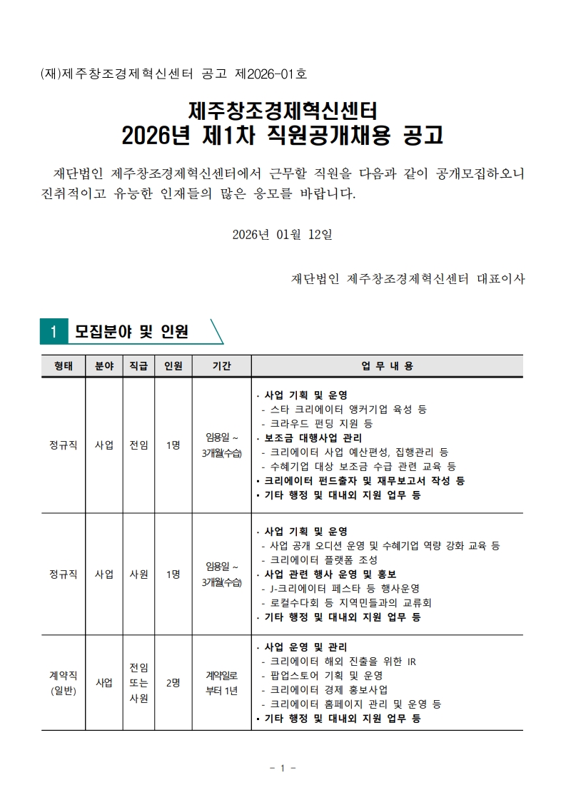 [타기관공고] 제주창조경제혁신센터 2026년도 제1차 직원 공개채용 공고..