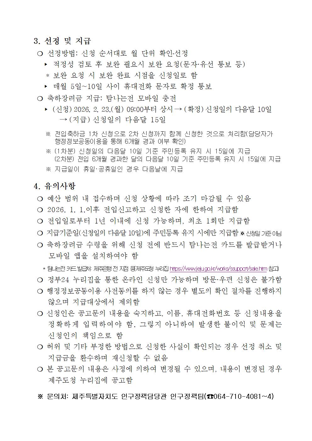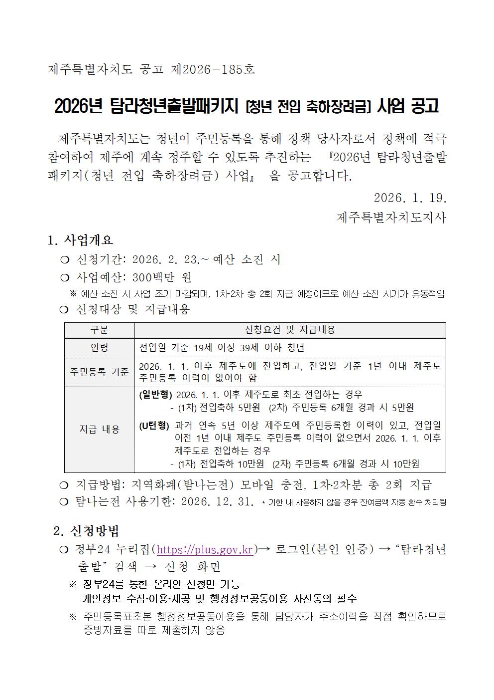 2026년 탐라청년출발패키지〔청년 전입 축하장려금〕사업 공고..