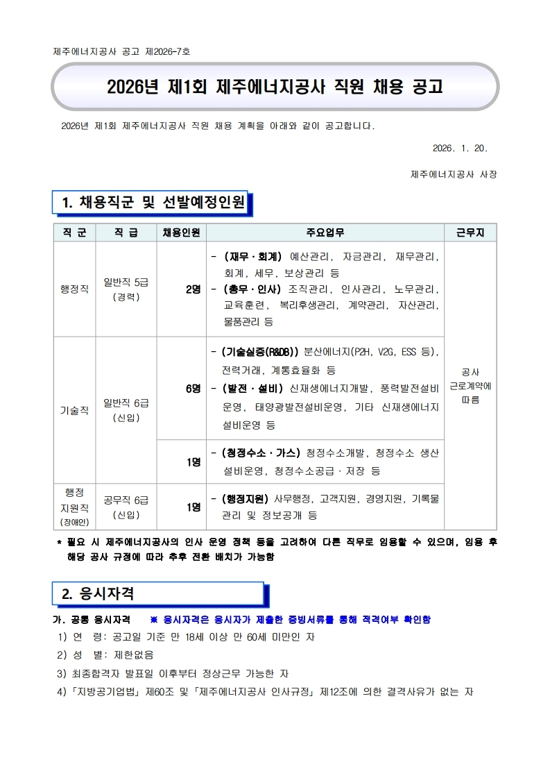 2026년 제1회 제주에너지공사 직원 채용 공고