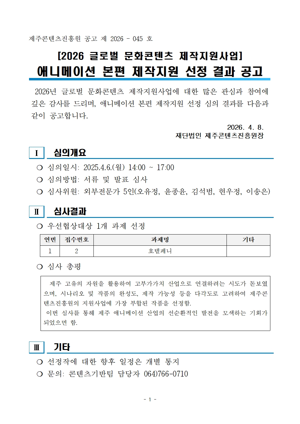 [2026 글로벌 문화콘텐츠 제작지원사업] 애니메이션 본편 제작지원 선정 결과 공고..