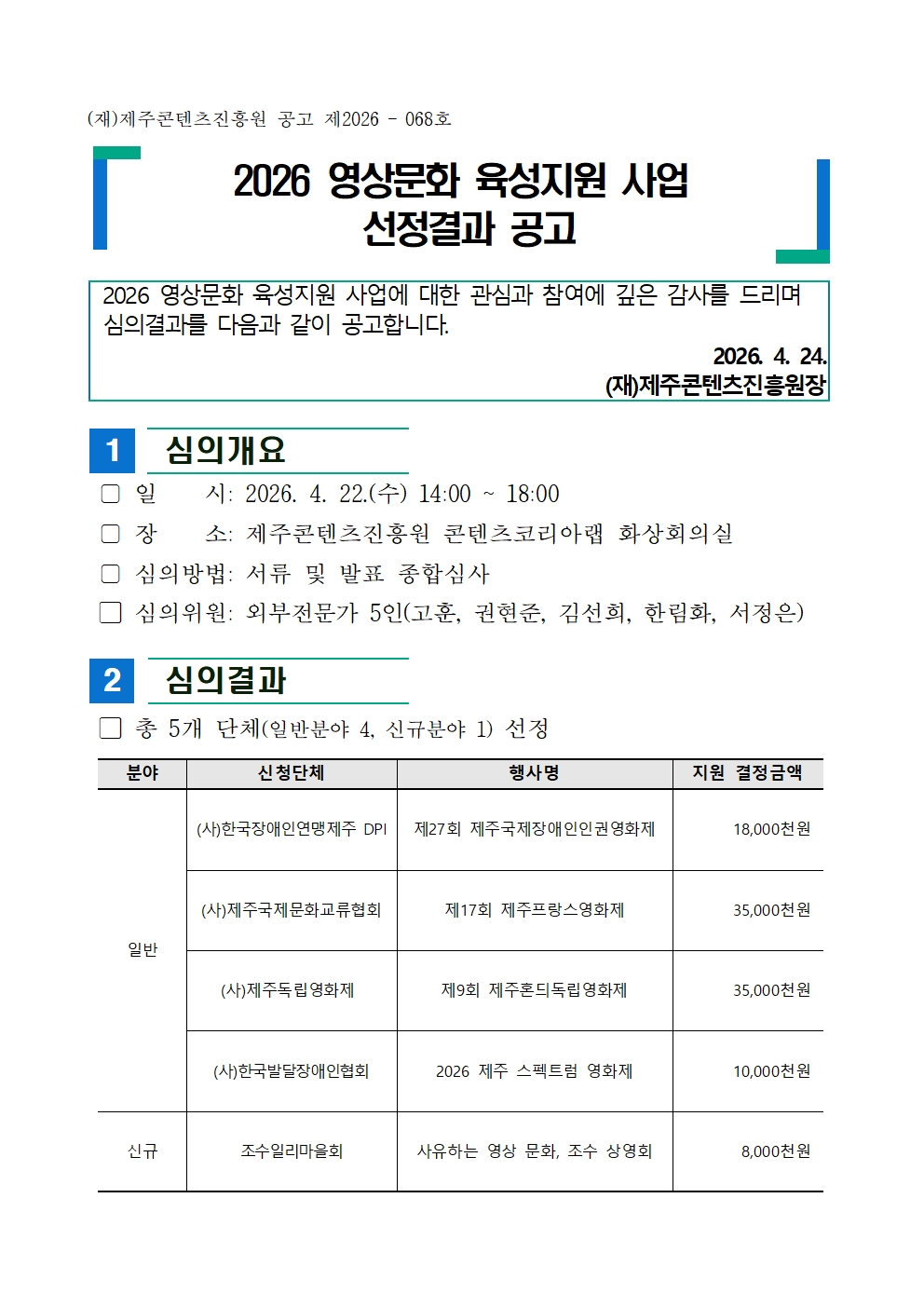 2026 영상문화 육성지원 사업 선정평가 결과 공고..