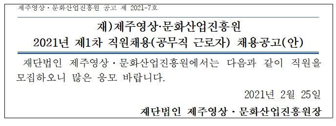 | [ 기관공고 ] 제주영상·문화산업진흥원 2021년 제1차 직원채용(공무직 근로자) 채용공고 | |||