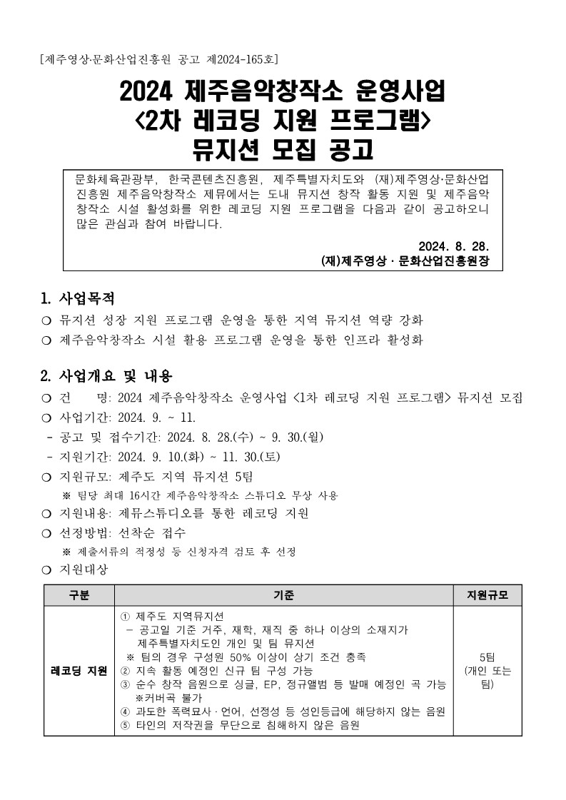 [ ] 2024 제주음악창작소 운영사업 「2차 레코딩 지원 프로그램」 공고