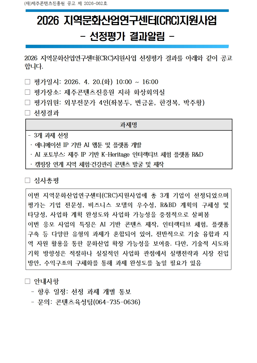 2026 제주콘텐츠코리아랩 「JEMI 디딤돌」 지원사업 최종 선정 결과 알림..