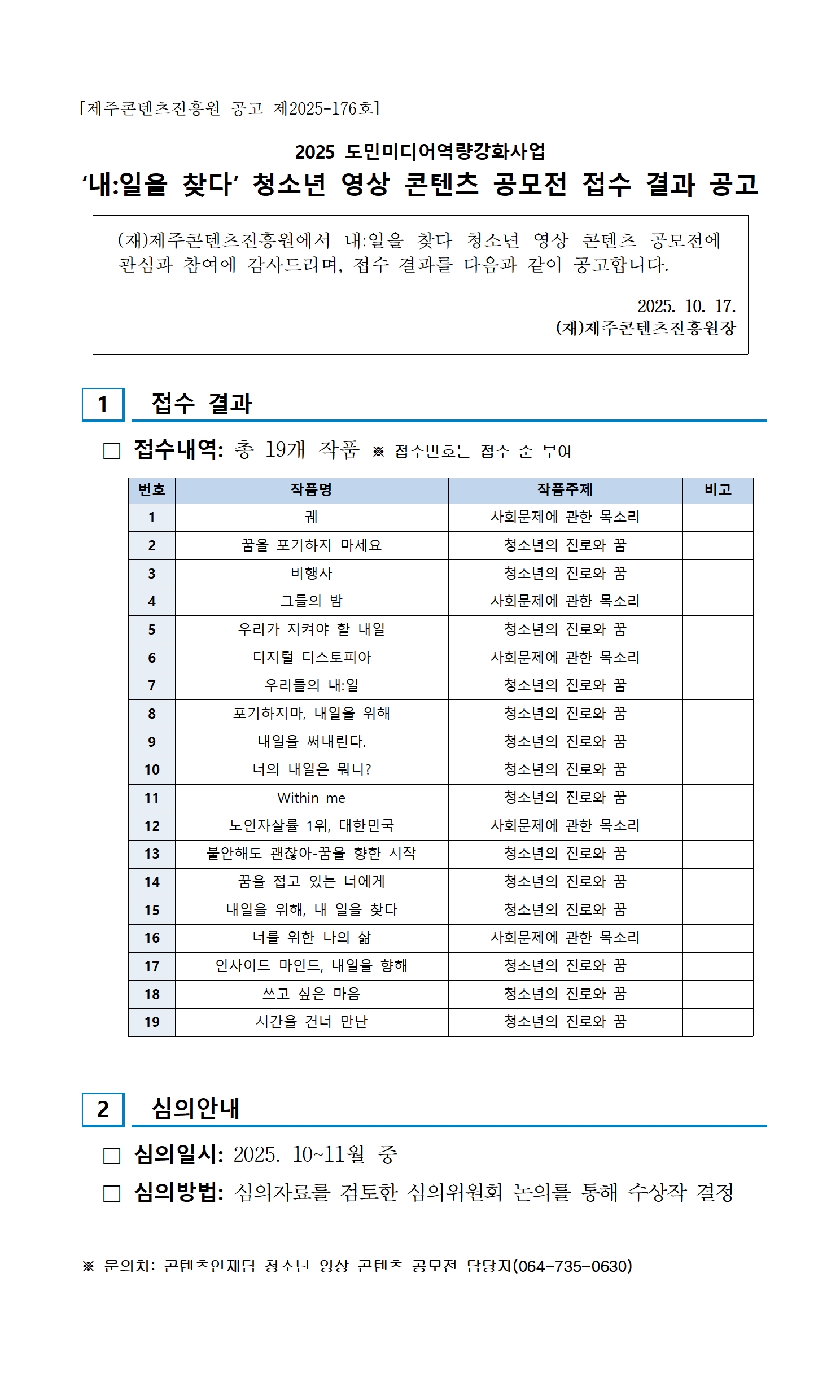 2025 제주 콘텐츠 청년 일자리 빌드업 지원사업 2차 심사결과 알..