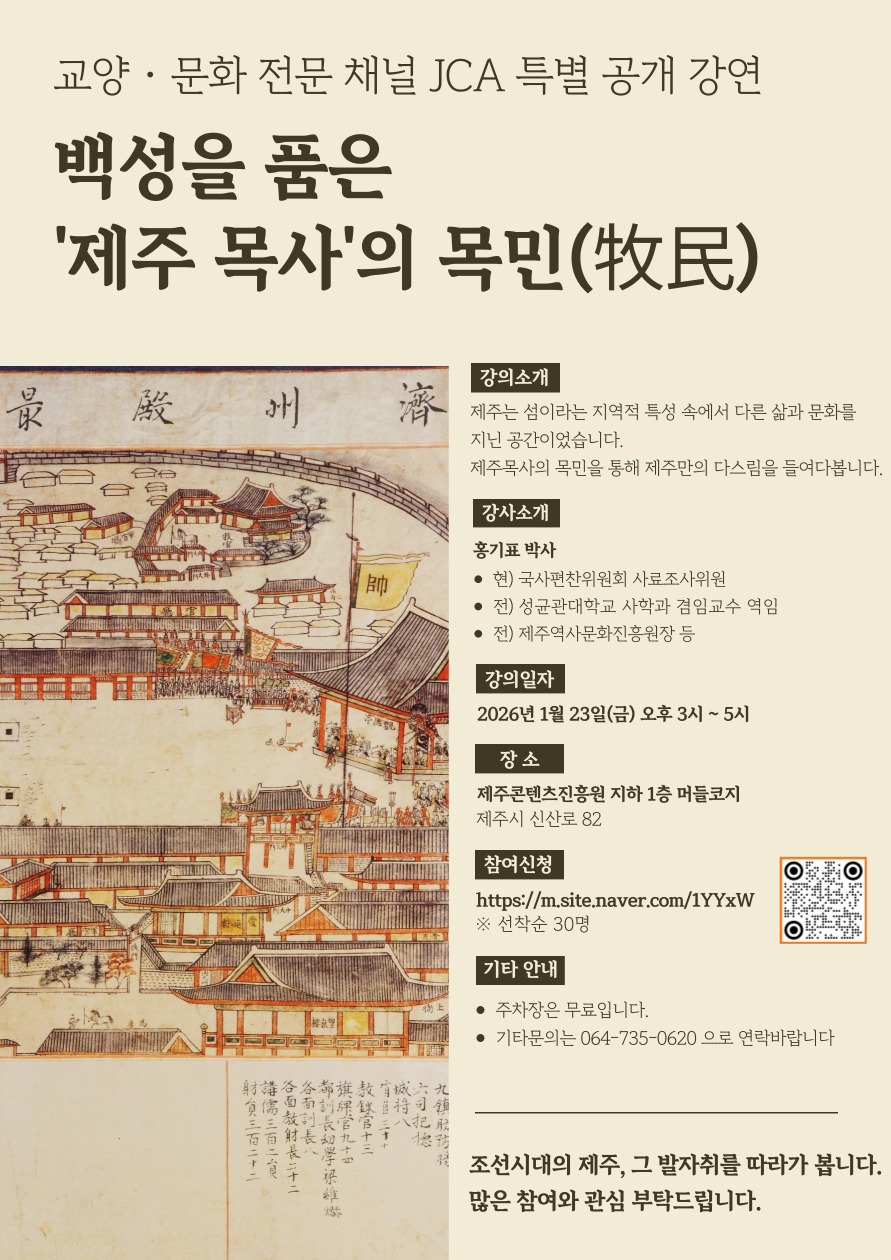 교양·문화전문채널 'JCA' 특별 강연 <백성을 품은 '제주목사'의 목민(牧民)> 수강생 모집 게시물 상세보기
