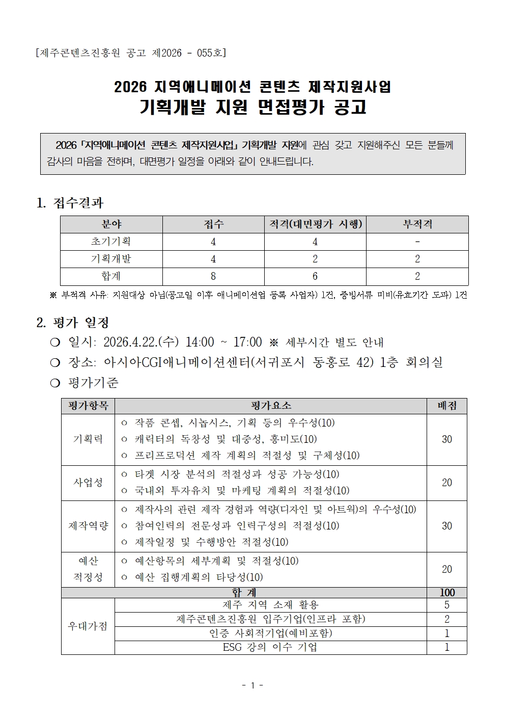 2026 지역애니메이션 콘텐츠 제작지원사업 기획개발 지원 면접평가 안내 공고..