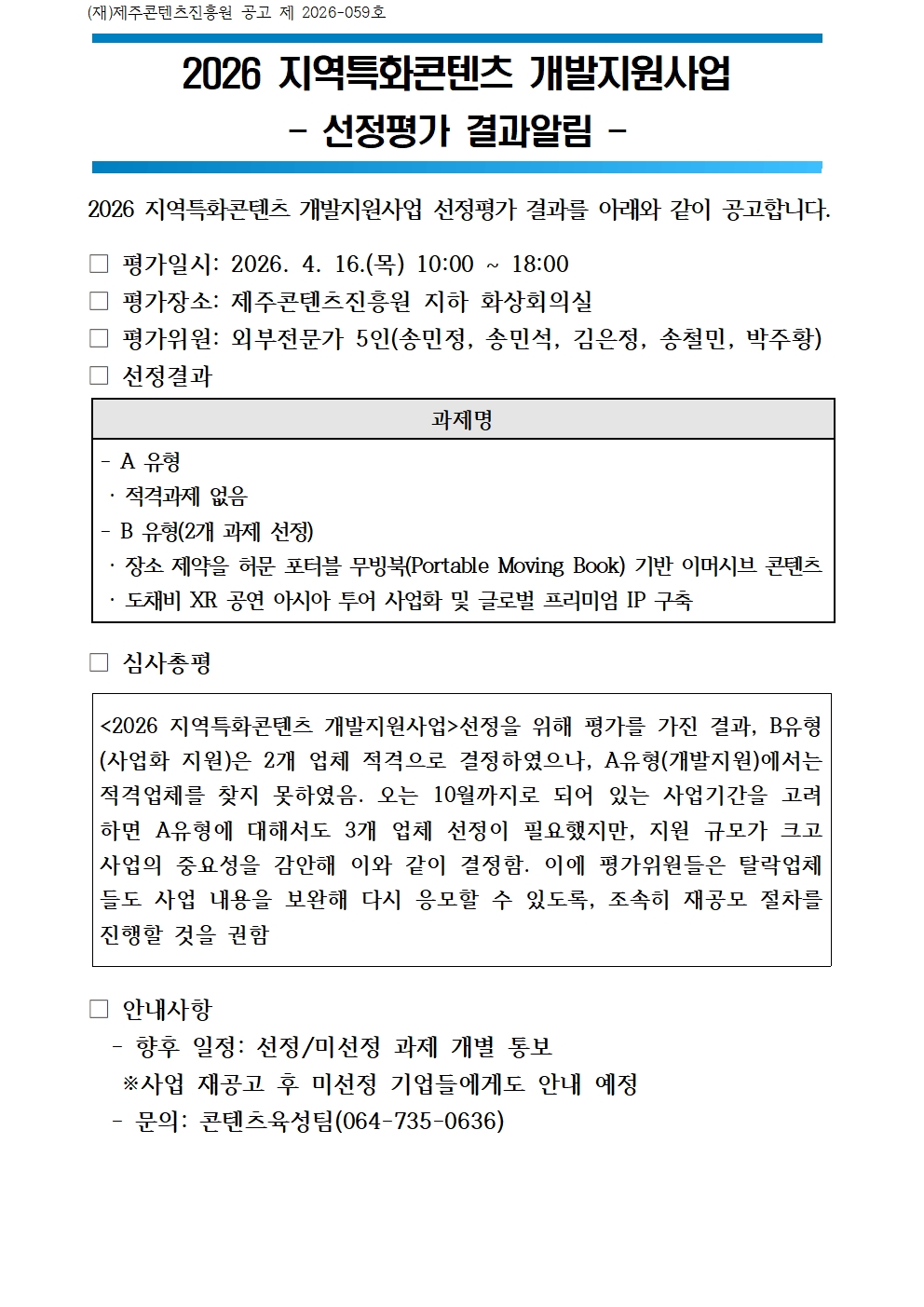 2026 지역특화콘텐츠 개발지원사업 선정평가 결과알림