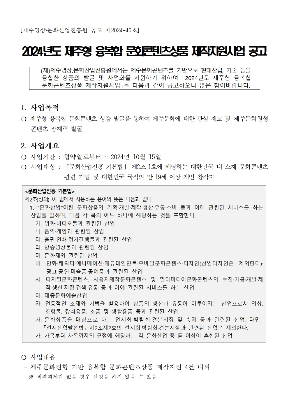 [ ] 2024년도 제주형 융복합 문화콘텐츠상품 제작지원사업 모집 공고