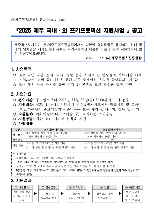 2025 제주 국내·외 프리프로덕션 지원사업 공고