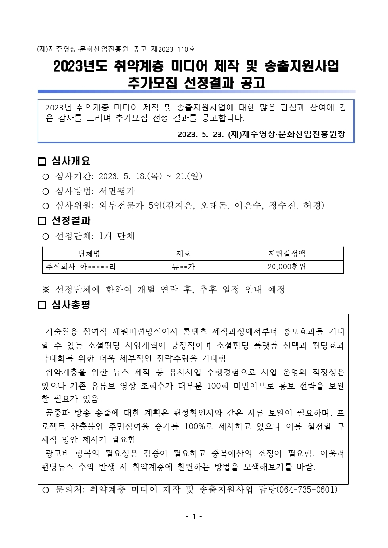 재단법인 제주영상・문화산업진흥원 임원 공개모집 최종 합격자 공고..