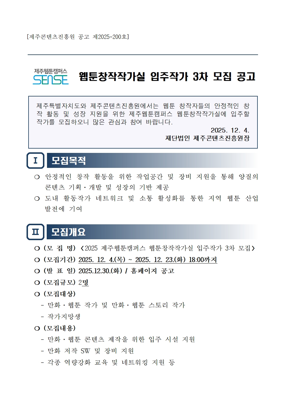 2025 제주웹툰캠퍼스 웹툰창작작가실 입주작가 모집 시행(3차)..