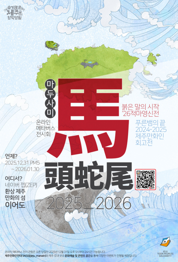일시: 2025. 12. 31. (수) ~ 2026. 1. 30.(금) 전시장소: 네이버 젭(ZEP) <환상 제주, 만화의 섬 - 이어도 > 전시내용 1) 2024~2025년간 도내 만화 창작자들의 창작활동 회고전 2) 2026년 붉은 말의 해(병오년)를 기원하는 '적마영신전' 3) 도내 문화예술 및 콘텐츠 관련 기관·공간 소개