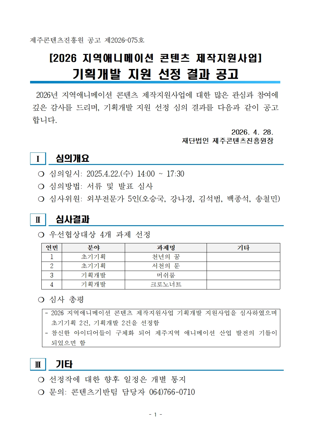2026 제주형 융복합 문화콘텐츠 상품제작 지원사업 선정결과 알..