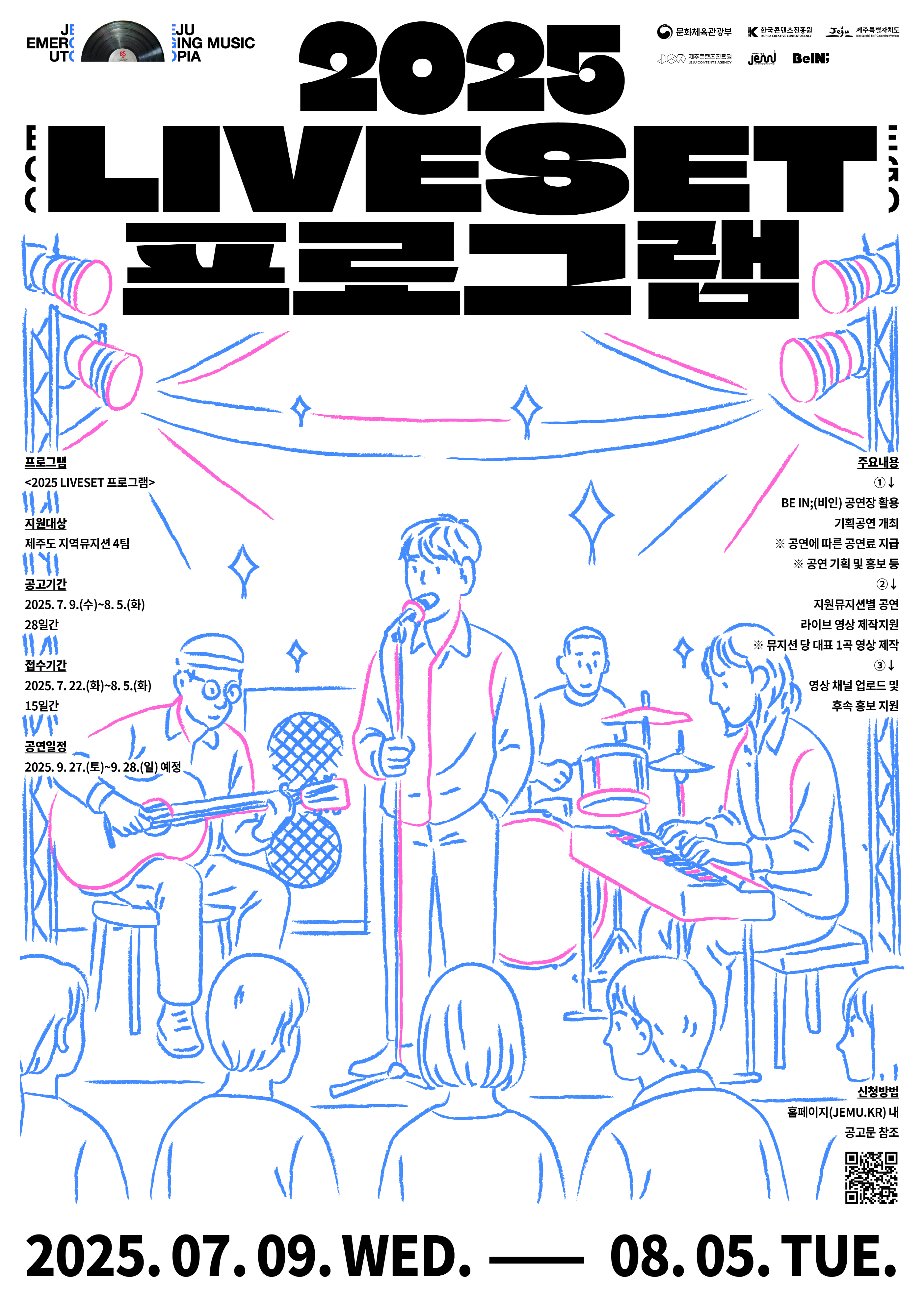 ❍ 이번 사업을 통해 Be IN; Live 기획공연이 오는 9월 27일(토)과 28일(일) 양일간 Be IN;(비인) 공연장에서 개최되며, 선정된 뮤지션은 본인 곡으로 30분 내외의 무대를 선보이게 된다. 참여 대상은 제주특별자치도에 거주하거나 재직·재학 중인 지역 뮤지션으로, 장르에 관계없이 누구나 지원할 수 있다.
